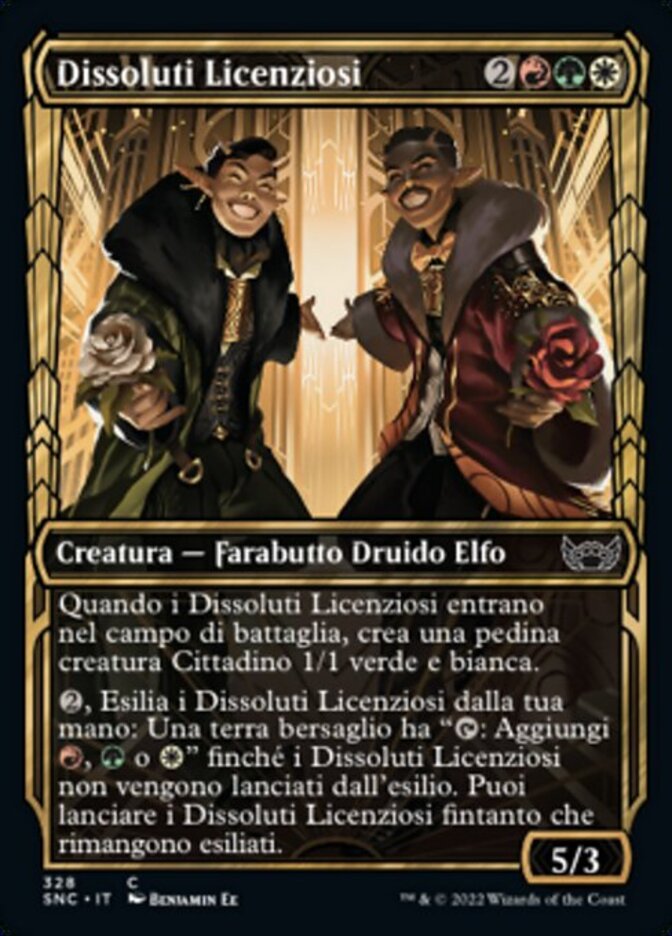 | Rules | When Rakish Revelers enters the battlefield, create a 1/1 green and white Citizen creature token. , Exile Rakish Revelers from your hand: Target land gains ": Add , , or " until Rakish Revelers is cast from exile. You may cast Rakish Revelers for as long as it remains exiled. |