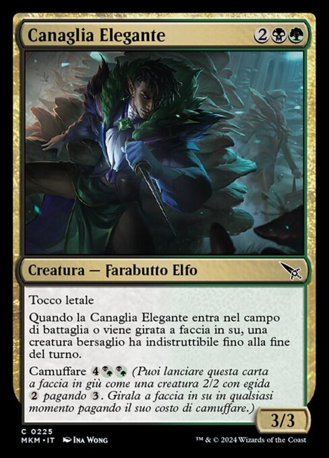 | Rules | Deathtouch When Rakish Scoundrel enters the battlefield or is turned face up, target creature gains indestructible until end of turn. Disguise (You may cast this card face down for as a 2/2 creature with ward . Turn it face up any time for its disguise cost.) |