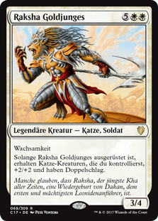 | Rules | Vigilance As long as Raksha Golden Cub is equipped, Cat creatures you control get +2/+2 and have double strike. |