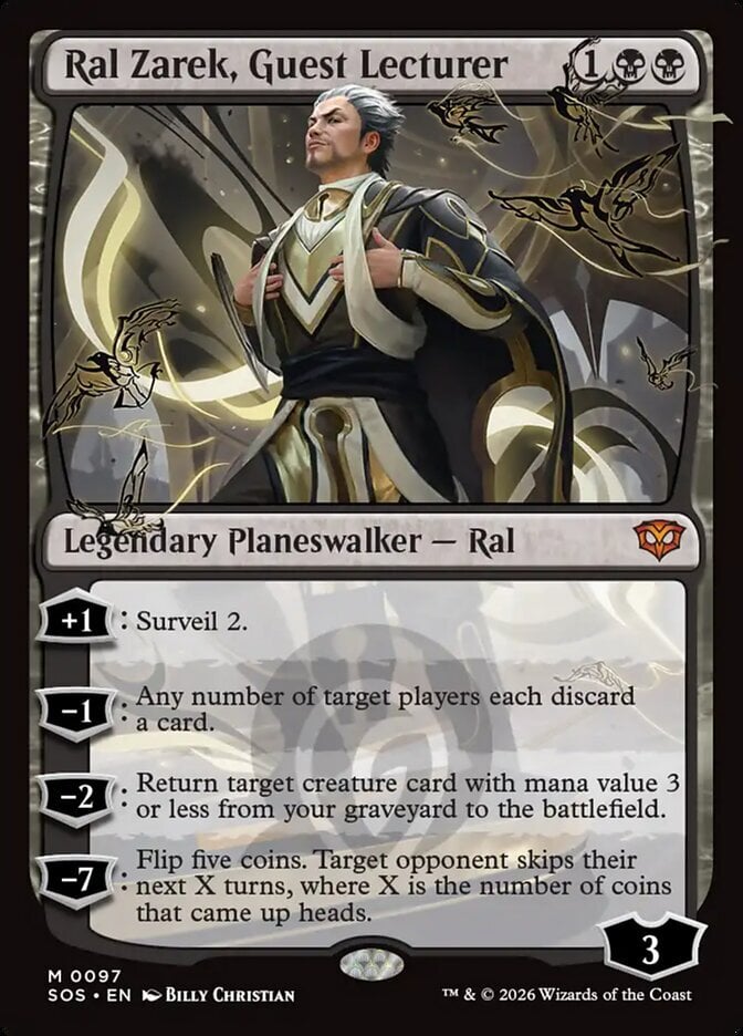 | Rules | +1: Surveil 2. −1: Any number of target players each discard a card. −2: Return target creature card with mana value 3 or less from your graveyard to the battlefield. −7: Flip five coins. Target opponent skips their next X turns, where X is the number of coins that came up heads. |