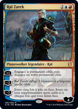 | Rules | +1: Tap target permanent, then untap another target permanent. −2: Ral Zarek deals 3 damage to any target. −7: Flip five coins. Take an extra turn after this one for each coin that comes up heads. |