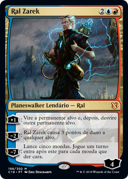 | Rules | +1: Tap target permanent, then untap another target permanent. −2: Ral Zarek deals 3 damage to any target. −7: Flip five coins. Take an extra turn after this one for each coin that comes up heads. |