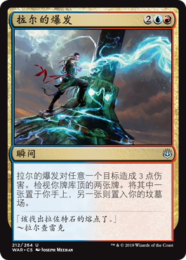 | Rules | Ral's Outburst deals 3 damage to any target. Look at the top two cards of your library. Put one of them into your hand and the other into your graveyard. |