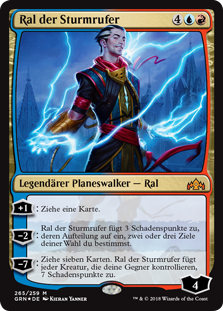 | Rules | +1: Draw a card. −2: Ral, Caller of Storms deals 3 damage divided as you choose among one, two, or three targets. −7: Draw seven cards. Ral, Caller of Storms deals 7 damage to each creature your opponents control. |
