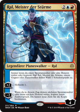 | Rules | Whenever you cast or copy an instant or sorcery spell, Ral, Storm Conduit deals 1 damage to target opponent or planeswalker. +2: Scry 1. −2: When you cast your next instant or sorcery spell this turn, copy that spell. You may choose new targets for the copy. |