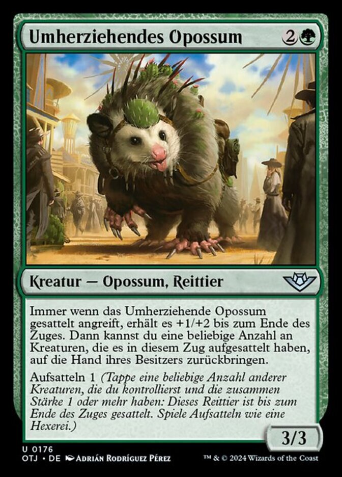 | Rules | Whenever Rambling Possum attacks while saddled, it gains +1/+2 until end of turn. Then you may return any number of creatures that saddled it this turn to their owner's hand. Saddle 1 (Tap any number of other creatures you control with total power 1 or more: This Mount becomes saddled until end of turn. Saddle only as a sorcery.) |