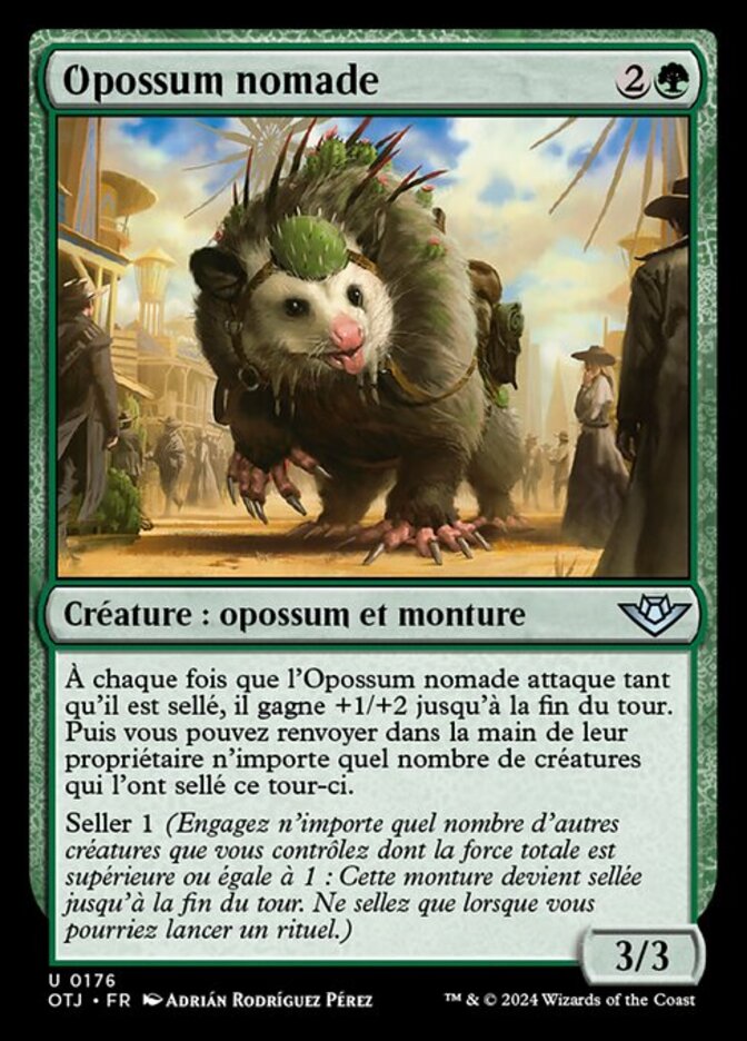 | Rules | Whenever Rambling Possum attacks while saddled, it gains +1/+2 until end of turn. Then you may return any number of creatures that saddled it this turn to their owner's hand. Saddle 1 (Tap any number of other creatures you control with total power 1 or more: This Mount becomes saddled until end of turn. Saddle only as a sorcery.) |