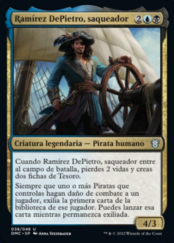 | Rules | When Ramirez DePietro, Pillager enters the battlefield, you lose 2 life and create two Treasure tokens. Whenever one or more Pirates you control deal combat damage to a player, exile the top card of that player's library. You may cast that card for as long as it remains exiled. |