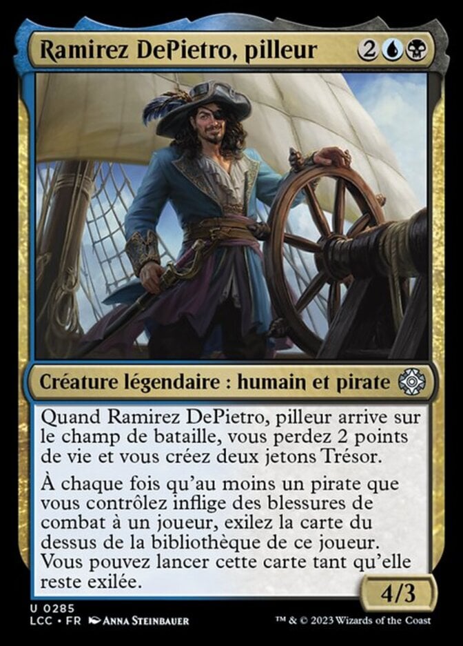 | Rules | When Ramirez DePietro, Pillager enters the battlefield, you lose 2 life and create two Treasure tokens. Whenever one or more Pirates you control deal combat damage to a player, exile the top card of that player's library. You may cast that card for as long as it remains exiled. |