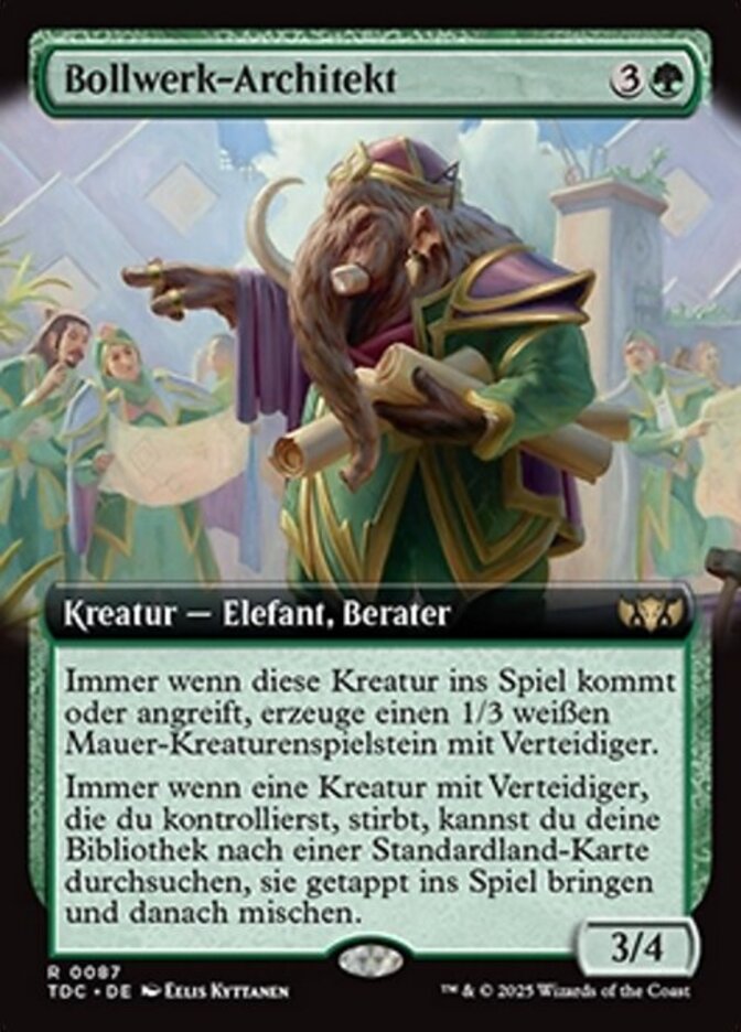 | Rules | Whenever this creature enters or attacks, create a 1/3 white Wall creature token with defender. Whenever a creature you control with defender dies, you may search your library for a basic land card, put that card onto the battlefield tapped, then shuffle. |