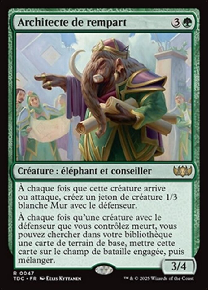 | Rules | Whenever this creature enters or attacks, create a 1/3 white Wall creature token with defender. Whenever a creature you control with defender dies, you may search your library for a basic land card, put that card onto the battlefield tapped, then shuffle. |