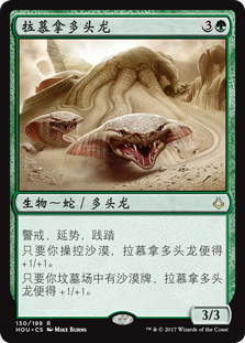 | Rules | Vigilance, reach, trample Ramunap Hydra gets +1/+1 as long as you control a Desert. Ramunap Hydra gets +1/+1 as long as there is a Desert card in your graveyard. |