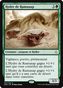 | Rules | Vigilance, reach, trample Ramunap Hydra gets +1/+1 as long as you control a Desert. Ramunap Hydra gets +1/+1 as long as there is a Desert card in your graveyard. |