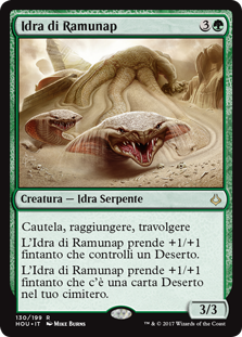 | Rules | Vigilance, reach, trample Ramunap Hydra gets +1/+1 as long as you control a Desert. Ramunap Hydra gets +1/+1 as long as there is a Desert card in your graveyard. |
