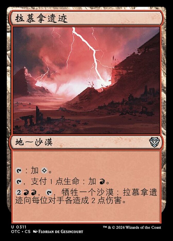 | Rules | : Add . , Pay 1 life: Add . , , Sacrifice a Desert: Ramunap Ruins deals 2 damage to each opponent. |