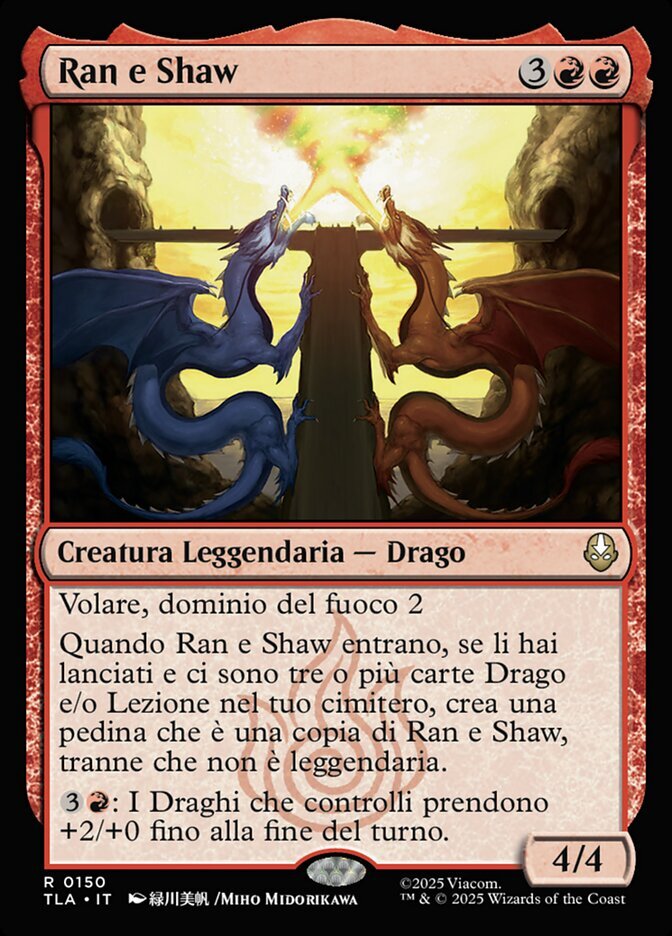 | Rules | Flying, firebending 2 When Ran and Shaw enter, if you cast them and there are three or more Dragon and/or Lesson cards in your graveyard, create a token that's a copy of Ran and Shaw, except it's not legendary. : Dragons you control get +2/+0 until end of turn. |