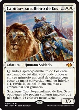 | Rules | When Ranger-Captain of Eos enters the battlefield, you may search your library for a creature card with mana value 1 or less, reveal it, put it into your hand, then shuffle. Sacrifice Ranger-Captain of Eos: Your opponents can't cast noncreature spells this turn. |