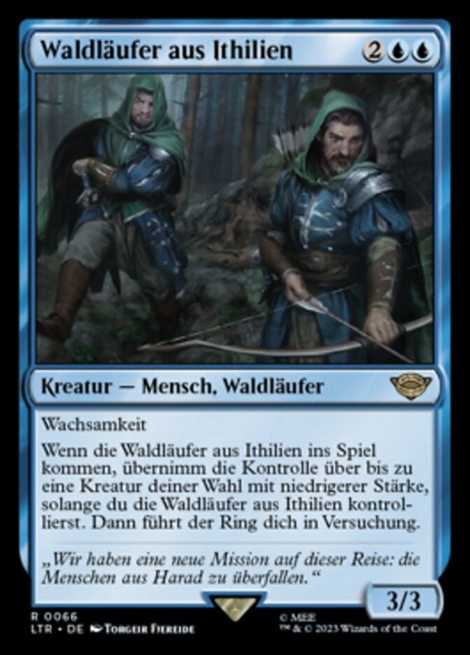 | Rules | Vigilance When Rangers of Ithilien enters the battlefield, gain control of up to one target creature with lesser power for as long as you control Rangers of Ithilien. Then the Ring tempts you. |