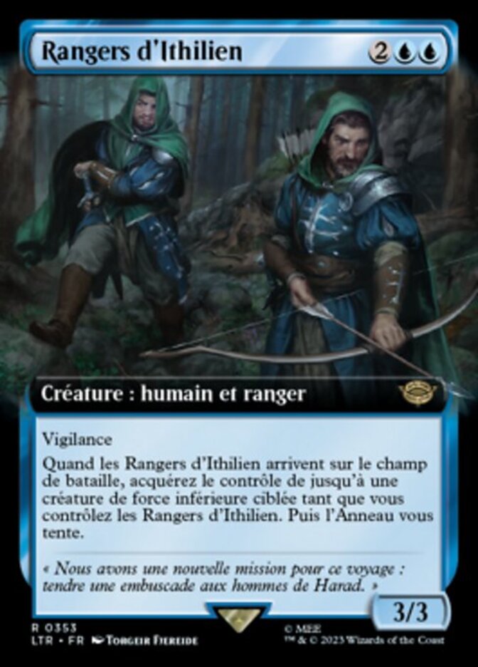| Rules | Vigilance When Rangers of Ithilien enters the battlefield, gain control of up to one target creature with lesser power for as long as you control Rangers of Ithilien. Then the Ring tempts you. |