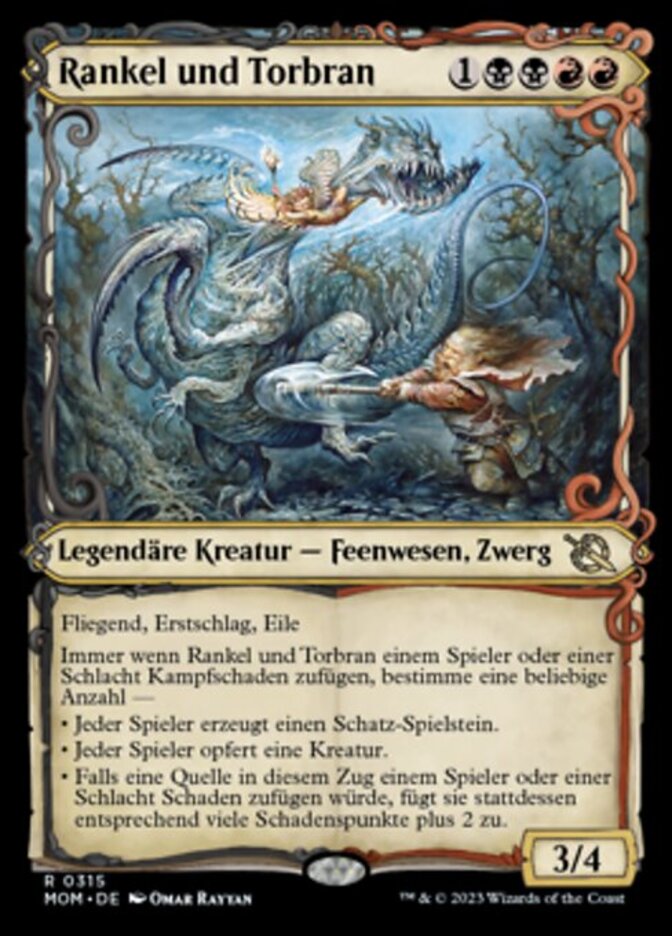 | Rules | Flying, first strike, haste Whenever Rankle and Torbran deals combat damage to a player or battle, choose any number — • Each player creates a Treasure token. • Each player sacrifices a creature. • If a source would deal damage to a player or battle this turn, it deals that much damage plus 2 instead. |