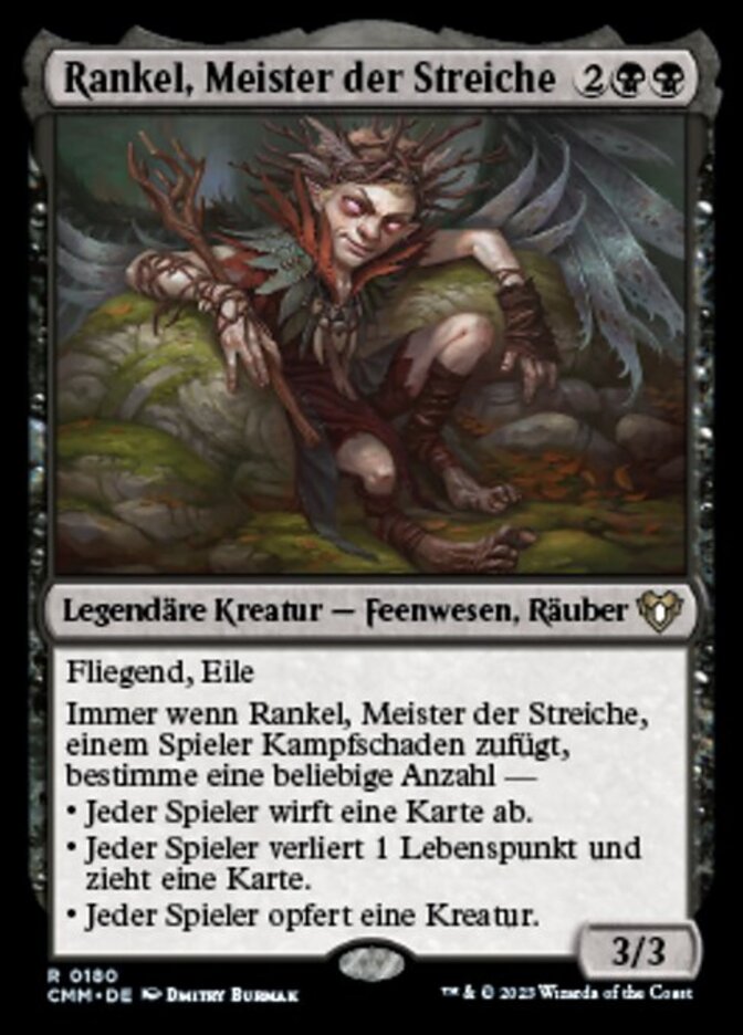 | Rules | Flying, haste Whenever Rankle, Master of Pranks deals combat damage to a player, choose any number — • Each player discards a card. • Each player loses 1 life and draws a card. • Each player sacrifices a creature. |