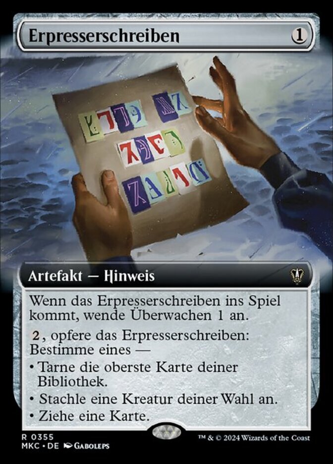| Rules | When Ransom Note enters the battlefield, surveil 1. , Sacrifice Ransom Note: Choose one — • Cloak the top card of your library. • Goad target creature. • Draw a card. |