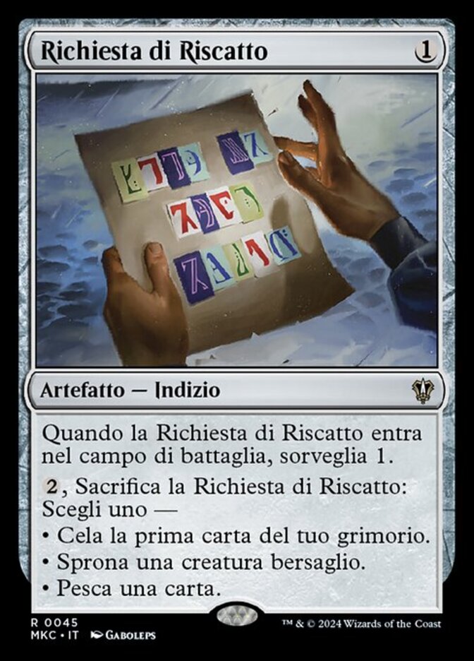 | Rules | When Ransom Note enters the battlefield, surveil 1. , Sacrifice Ransom Note: Choose one — • Cloak the top card of your library. • Goad target creature. • Draw a card. |