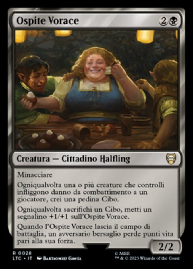 | Rules | Menace Whenever one or more creatures you control deal combat damage to a player, create a Food token. Whenever you sacrifice a Food, put a +1/+1 counter on Rapacious Guest. When Rapacious Guest leaves the battlefield, target opponent loses life equal to its power. |