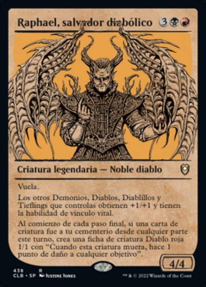 | Rules | Flying Other Demons, Devils, Imps, and Tieflings you control get +1/+1 and have lifelink. At the beginning of each end step, if a creature card was put into your graveyard from anywhere this turn, create a 1/1 red Devil creature token with "When this creature dies, it deals 1 damage to any target." |