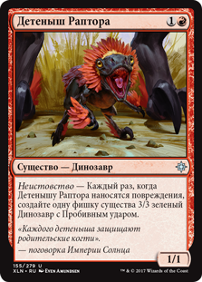 | Rules | Enrage — Whenever Raptor Hatchling is dealt damage, create a 3/3 green Dinosaur creature token with trample. |