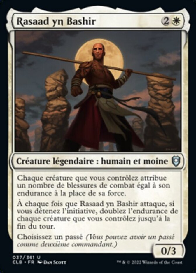 | Rules | Each creature you control assigns combat damage equal to its toughness rather than its power. Whenever Rasaad yn Bashir attacks, if you have the initiative, double the toughness of each creature you control until end of turn. Choose a Background (You can have a Background as a second commander.) |