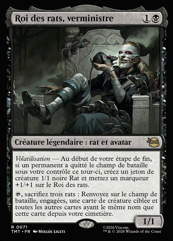 | Rules | Disappear — At the beginning of your end step, if a permanent left the battlefield under your control this turn, create a 1/1 black Rat creature token and put a +1/+1 counter on Rat King. , Sacrifice three Rats: Return target creature card and all other cards with the same name as that card from your graveyard to the battlefield tapped. |