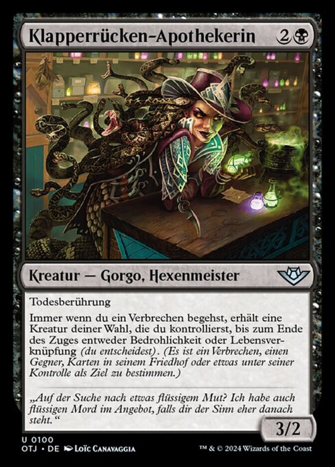 | Rules | Deathtouch Whenever you commit a crime, target creature you control gains your choice of menace or lifelink until end of turn. (Targeting opponents, anything they control, and/or cards in their graveyards is a crime.) |
