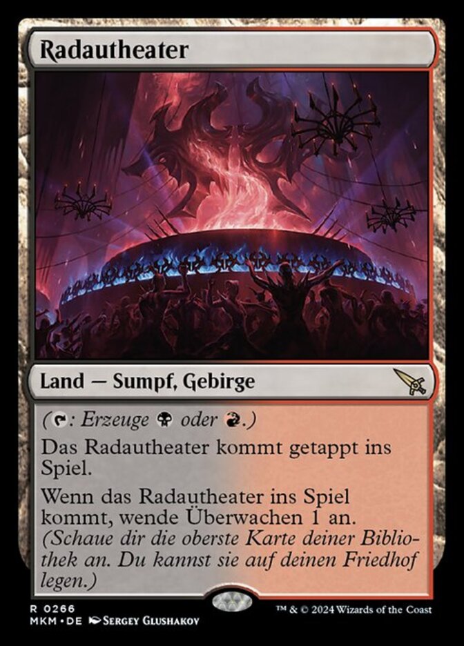 | Rules | (: Add or .) Raucous Theater enters the battlefield tapped. When Raucous Theater enters the battlefield, surveil 1. (Look at the top card of your library. You may put it into your graveyard.) |