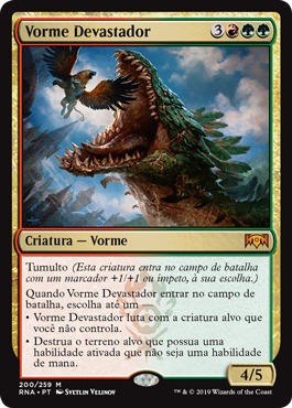 | Rules | Riot (This creature enters the battlefield with your choice of a +1/+1 counter or haste.) When Ravager Wurm enters the battlefield, choose up to one — • Ravager Wurm fights target creature you don't control. • Destroy target land with an activated ability that isn't a mana ability. |