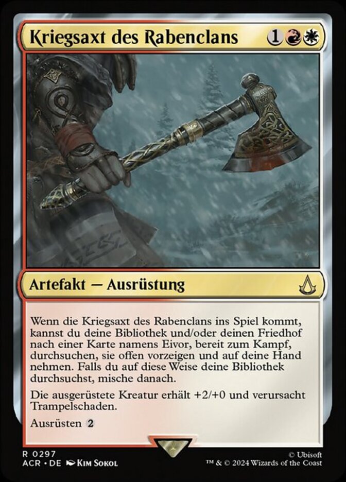 Rules When Raven Clan War-Axe enters the battlefield, you may search your library and/or graveyard for a card named Eivor, Battle-Ready, reveal it, and put it into your hand. If you search your library this way, shuffle.