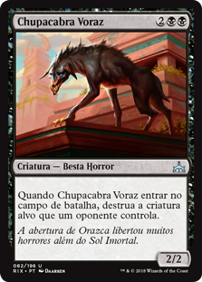 | Rules | When Ravenous Chupacabra enters the battlefield, destroy target creature an opponent controls. |