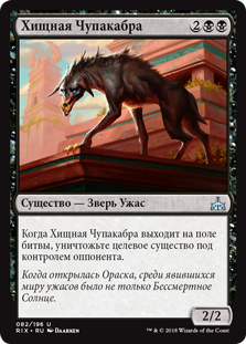 | Rules | When Ravenous Chupacabra enters the battlefield, destroy target creature an opponent controls. |
