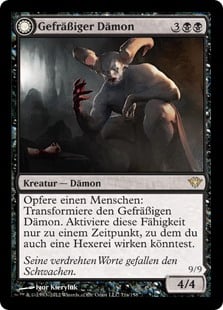 | Rules | Sacrifice a Human: Transform Ravenous Demon. Activate only as a sorcery. // Flying, trample At the beginning of your upkeep, sacrifice a Human. If you can't, tap Archdemon of Greed and it deals 9 damage to you. |