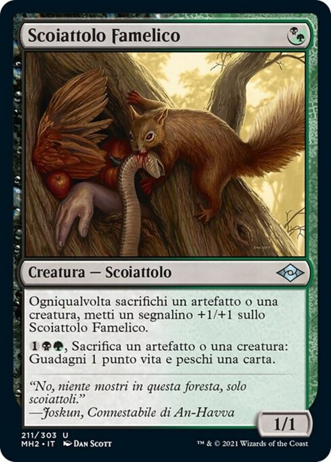 | Rules | Whenever you sacrifice an artifact or creature, put a +1/+1 counter on Ravenous Squirrel. , Sacrifice an artifact or creature: You gain 1 life and draw a card. |