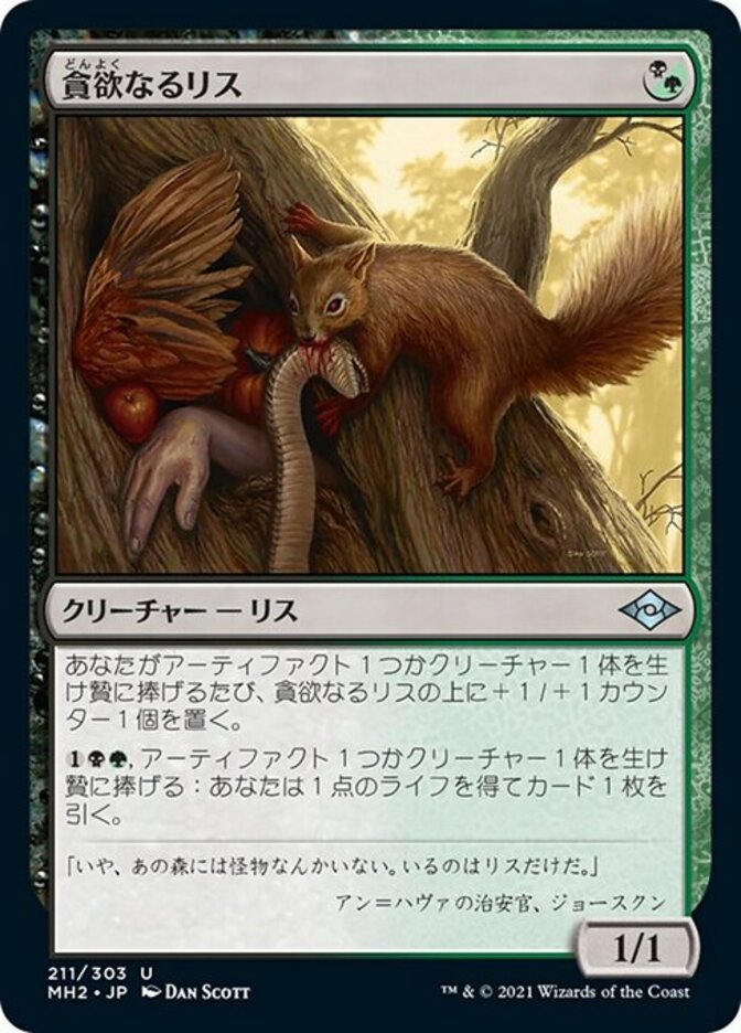 | Rules | Whenever you sacrifice an artifact or creature, put a +1/+1 counter on Ravenous Squirrel. , Sacrifice an artifact or creature: You gain 1 life and draw a card. |