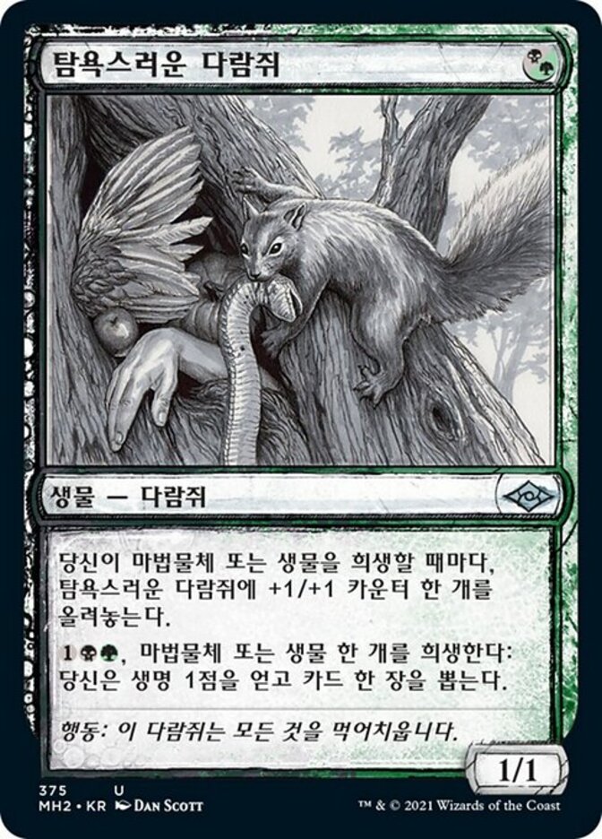 | Rules | Whenever you sacrifice an artifact or creature, put a +1/+1 counter on Ravenous Squirrel. , Sacrifice an artifact or creature: You gain 1 life and draw a card. |