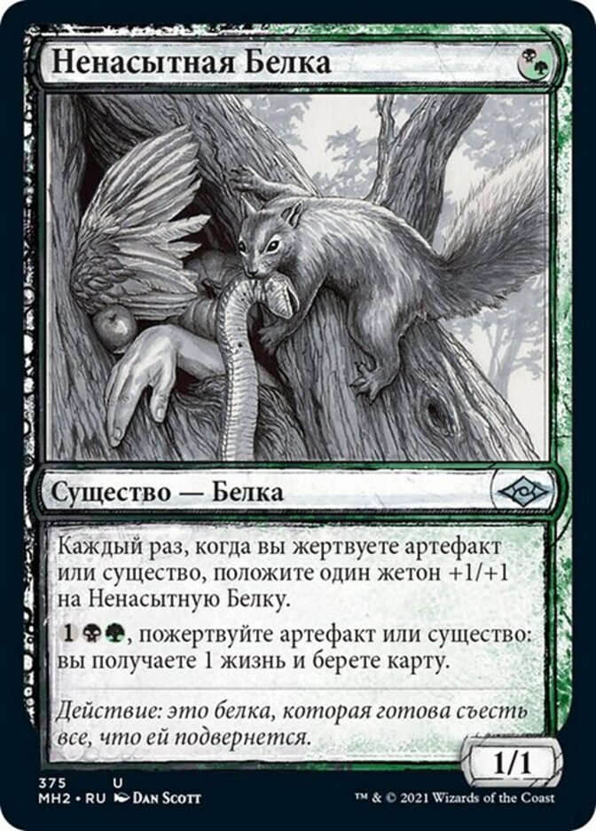 | Rules | Whenever you sacrifice an artifact or creature, put a +1/+1 counter on Ravenous Squirrel. , Sacrifice an artifact or creature: You gain 1 life and draw a card. |