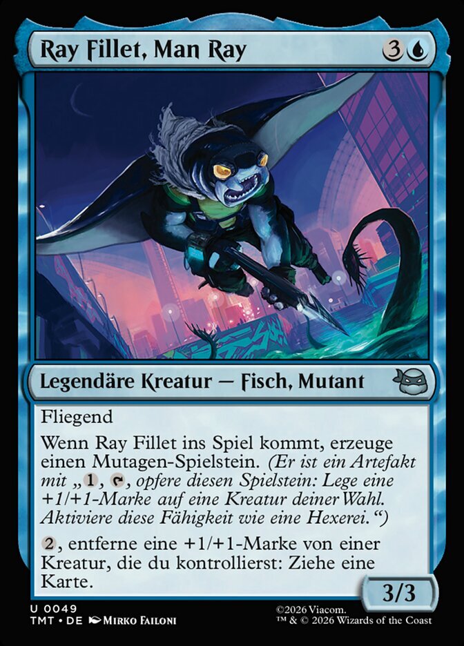 | Rules | Flying When Ray Fillet enters, create a Mutagen token. (It's an artifact with ", , Sacrifice this token: Put a +1/+1 counter on target creature. Activate only as a sorcery.") , Remove a +1/+1 counter from a creature you control: Draw a card. |