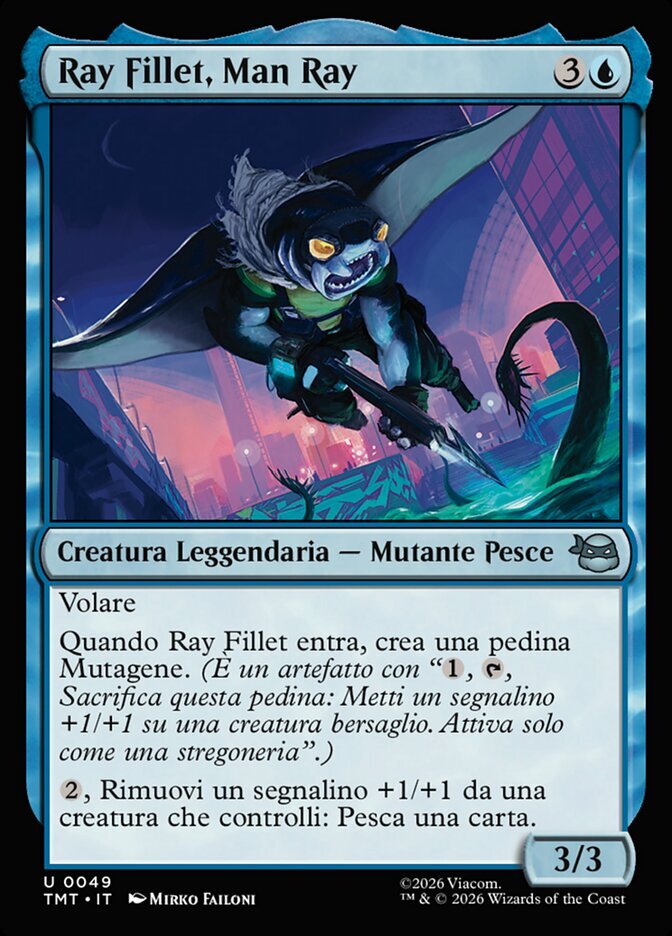 | Rules | Flying When Ray Fillet enters, create a Mutagen token. (It's an artifact with ", , Sacrifice this token: Put a +1/+1 counter on target creature. Activate only as a sorcery.") , Remove a +1/+1 counter from a creature you control: Draw a card. |