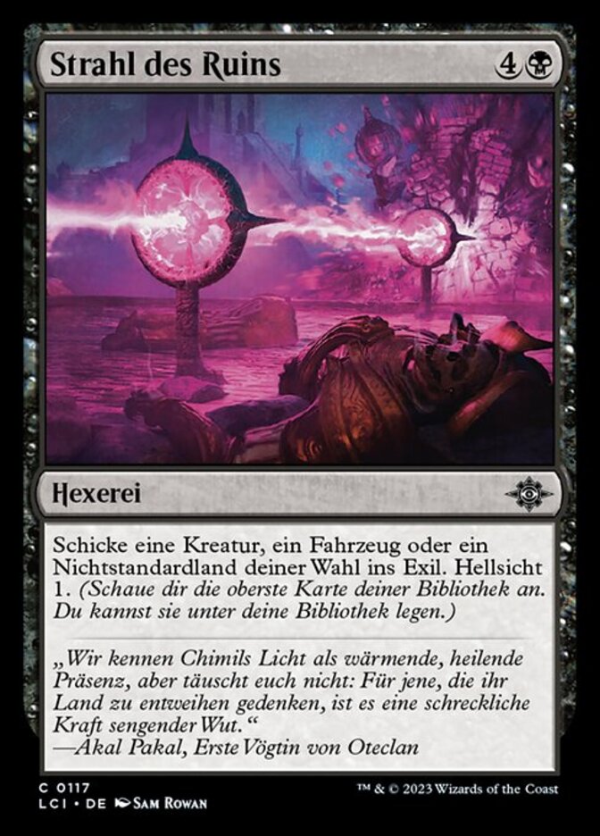 | Rules | Exile target creature, Vehicle, or nonbasic land. Scry 1. (Look at the top card of your library. You may put that card on the bottom.) |