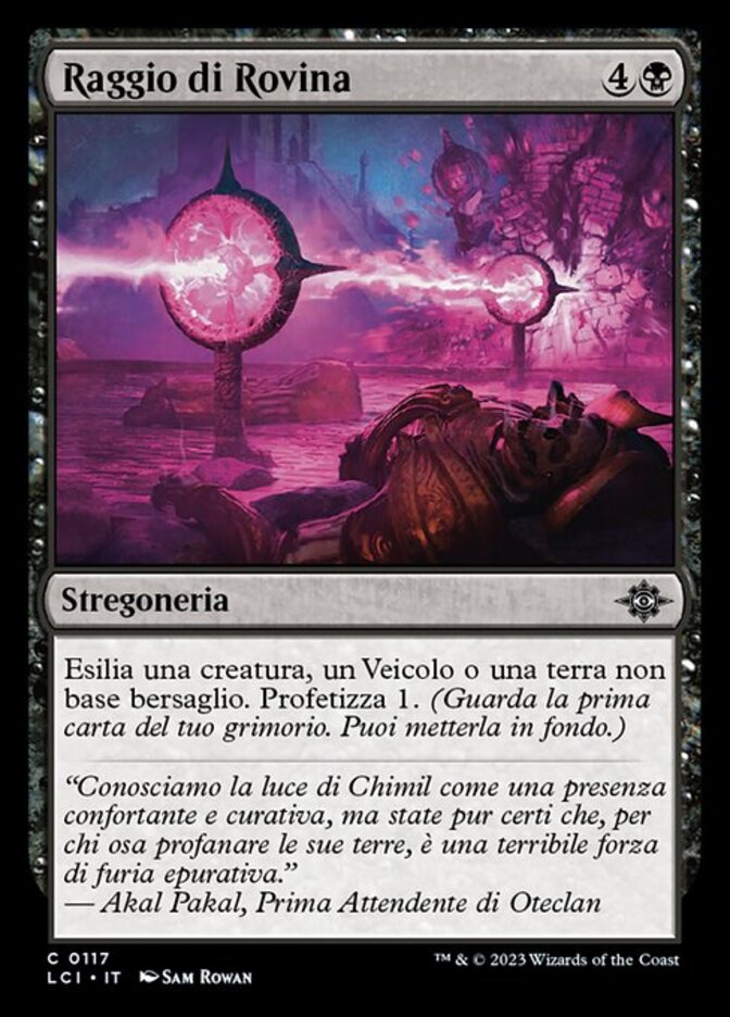 | Rules | Exile target creature, Vehicle, or nonbasic land. Scry 1. (Look at the top card of your library. You may put that card on the bottom.) |