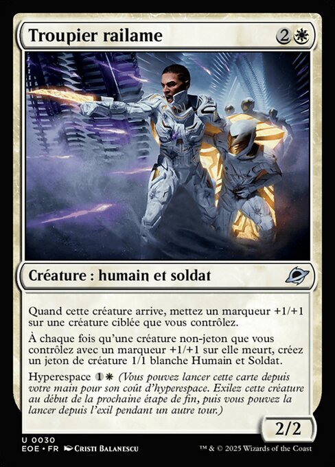 | Rules | When this creature enters, put a +1/+1 counter on target creature you control. Whenever a nontoken creature you control with a +1/+1 counter on it dies, create a 1/1 white Human Soldier creature token. Warp (You may cast this card from your hand for its warp cost. Exile this creature at the beginning of the next end step, then you may cast it from exile on a later turn.) |