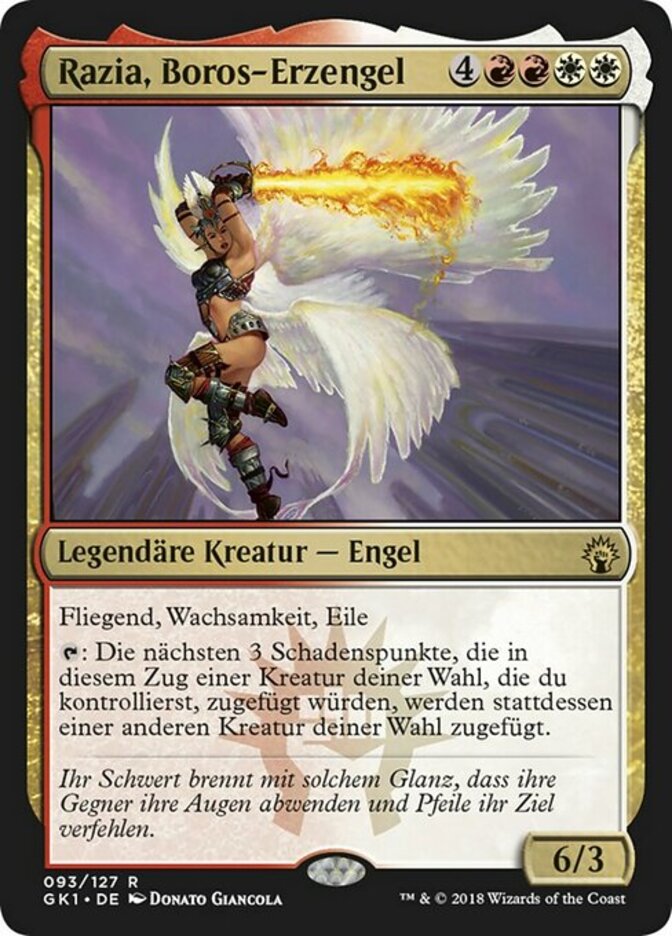 | Rules | Flying, vigilance, haste : The next 3 damage that would be dealt to target creature you control this turn is dealt to another target creature instead. |