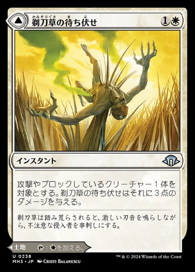 | Rules | Razorgrass Ambush deals 3 damage to target attacking or blocking creature. // As Razorgrass Field enters the battlefield, you may pay 3 life. If you don't, it enters the battlefield tapped. : Add . |
